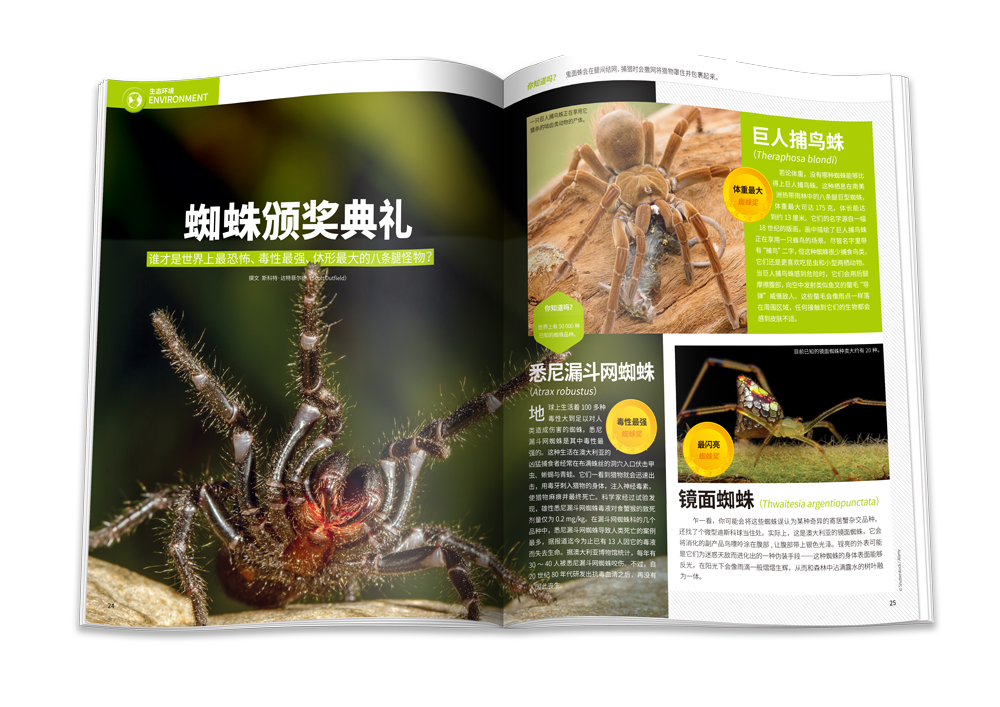 你以为蜘蛛只是躲在角落的沉默猎手?并非如此。世界上有超过5万种蜘蛛,它们各个身怀绝技!在这篇文章中你将见识到毒性最强的悉尼漏斗网蜘蛛,有着蓝色外表的古蒂蓝宝石捕鸟蛛以及会翻跟头、会跳“旋转扭臀舞”、精通伪装、能集体狩猎的各类奇蛛。……